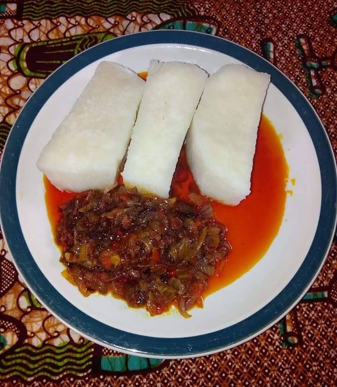 What you see above is white boiled yam served with palm oil sauce made from pepper, salt, utazi, and ukpaka/ugba.
